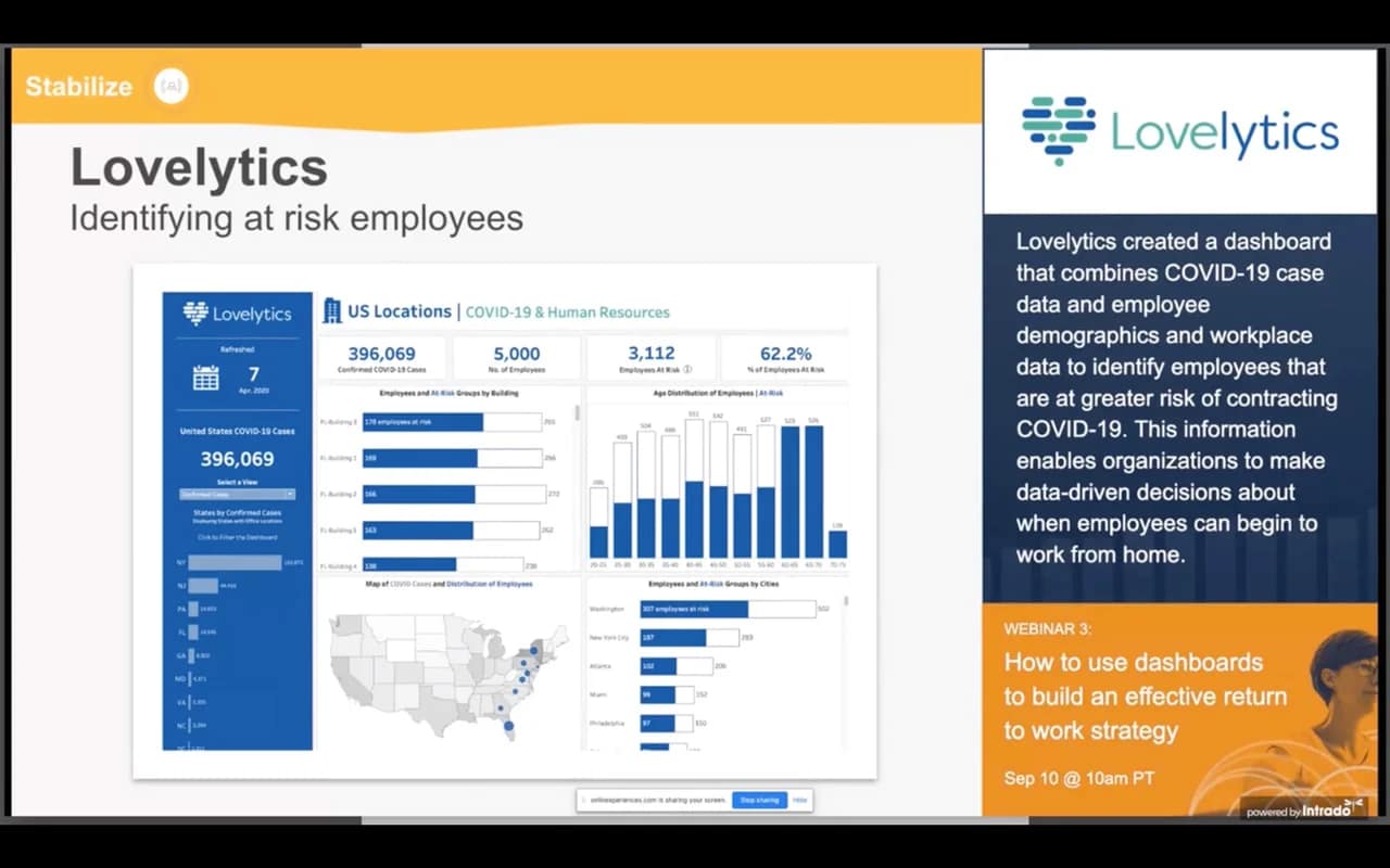 Usando una dashboard come questa di Lovelytics si possono evidenziare i punti critici, come i dipendenti per fasce d’età e le località che si trovano in prossimità di un nuovo focolaio. E si possono usare queste informazioni per scaglionare lo smartworking dei dipendenti in modo strategico ed efficiente.
