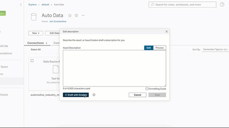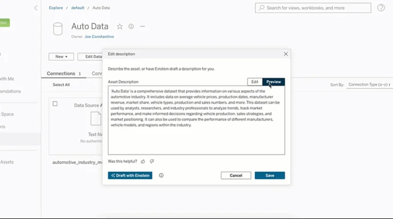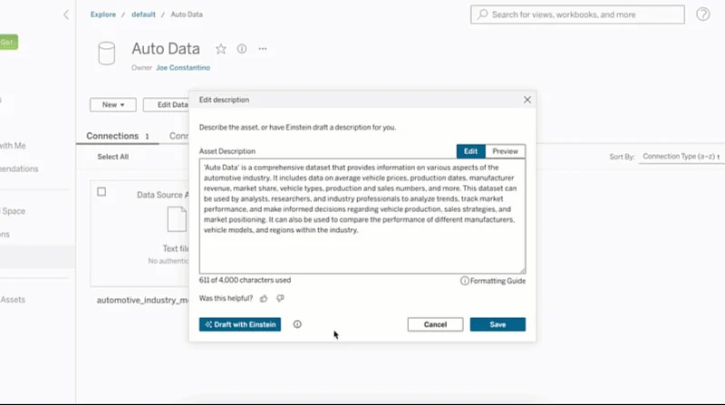 Tableau Agent crea descrizioni delle tue risorse di dati prendendo spunto dagli attributi forniti nell’origine dati. Questo processo ti permette di esaminare, modificare e pubblicare le informazioni, migliorando così l’affidabilità e la rintracciabilità dei tuoi dati. Le descrizioni create tramite intelligenza artificiale non solo ottimizzano il tuo tempo, ma offrono anche un approccio coerente e informativo per comunicare il fine e il contenuto delle tue risorse di dati.