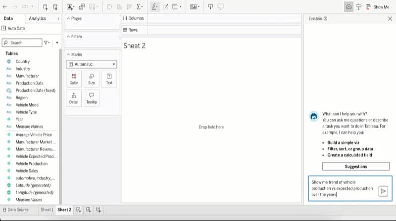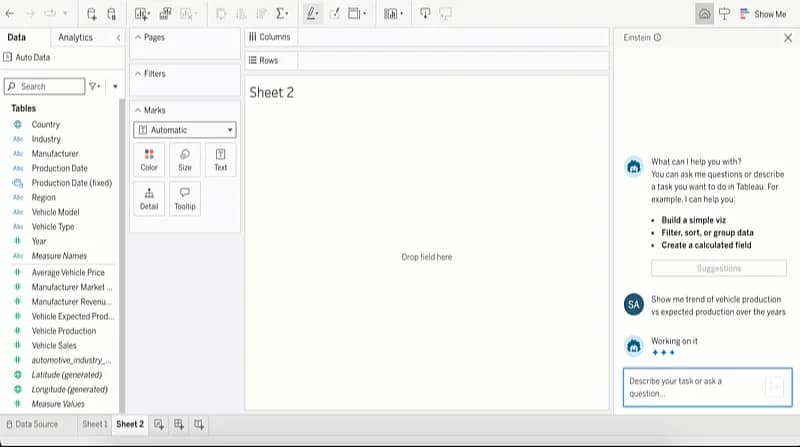 Esplora i tuoi dati attraverso il linguaggio naturale direttamente nell’ambiente di web authoring di Tableau Cloud. Converti le tue domande in visualizzazioni, esegui calcoli per migliorare l’analisi e ricevi suggerimenti sulle interrogazioni da effettuare, tutto in relazione ai tuoi dati. Tableau Agent lavora al tuo fianco, permettendoti di passare con facilità dalle operazioni manuali di trascinamento delle selezioni alla modifica delle formule, fino all’invio delle richieste tramite Tableau Agent.