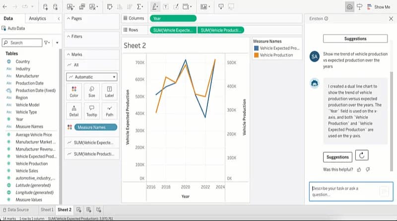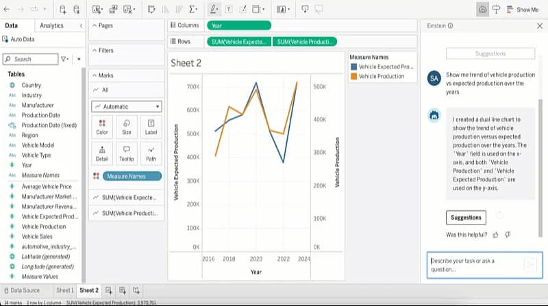 Tableau Agent (ex Einstein Copilot) è un assistente AI integrato in Tableau Cloud e Desktop (v. 2025.1+) che, interagendo con gli utenti in linguaggio naturale, facilita esplorazione delle dashboard, la creazione di visualizzazioni di dati e l’esecuzione di calcoli, secondo il modello Einstein Trust Layer.